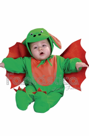 Costume for baby Dragon. Delightful dragon costume for baby in the colors green and red, with adorable wings, ears and claws, and a funny face with eyes, nose and mouth that comes out your baby's head. This costume is so cute that your little dragon will not go unnoticed. Perfect for a costume party!