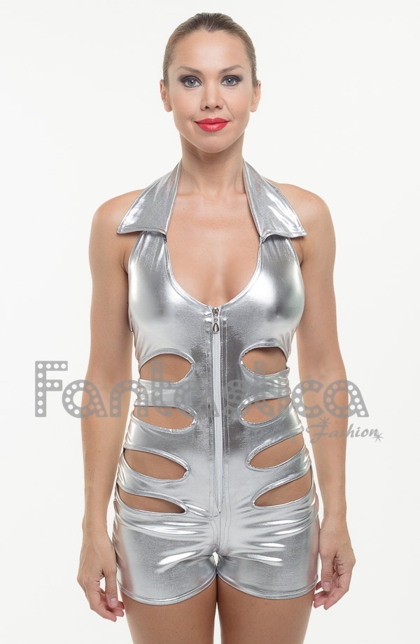 Sexy Silver Jumpsuit for woman, model Eva. This short and sexy jumpsuit with slits is great for shows, events and dance performances. Metallic effect. Made of elastic material. Get ready to shine and leave everyone breathless! The perfect complement for acrobatic performers, dancers, gymnastics, go-go dancers, artists and strippers. Incredible short sexy jumpsuit. One size. Good price for value.