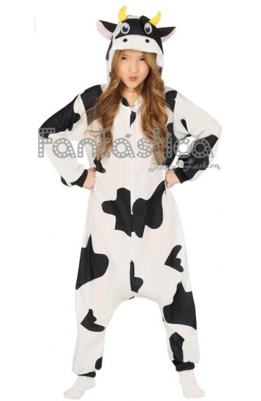 Divertido y simpático Disfraz para Niño y Niña de Vaca Pijama perfecto para Carnaval, Halloween, fiestas de disfraces, espectáculos, actos escolares y eventos especiales del colegio. El disfraz para niño y niña de vaca pijama incluye mono con capucha. Tallas: G88419 5-6, G88420 7-9, G88421 10-12.