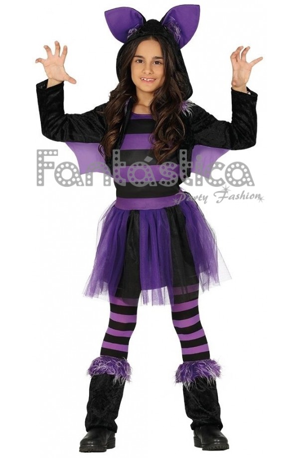 Disfraz para Niña Murciélago Lila. Chulísimo Disfraz para Niña Murciélago Lila, ideal para Carnaval, Halloween, fiestas de disfraces, espectáculos, obras de teatro, shows, actos escolares y eventos especiales del colegio. El disfraz para niña Murciélago Lila incluye vestido con capucha y cubrebotas. Tu princesa será el murciélago vampiro más simpático y dulce del mundo!