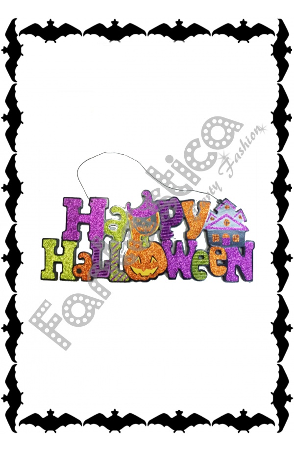 Adorno Colgante para Decoración de Halloween - Happy Halloween. Artículo estupendo para decoración de fiestas de Halloween en Discotecas, Pub's, Restaurantes, Colegios y casas particulares y así crear un ambiente autenticamente terrorífico. Además estos adornos de Halloween son reutilizables ¡¡Celebra tu fiesta con la decoración para Halloween de Fantástica! Tamaño: 32 x 11 cm.