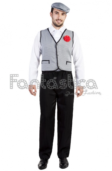 Precioso conjunto de chulapo madrileño tradicional, perfecto para participar en la celebración de las fiestas populares de Madrid, como San Isidro Labrador, San Cayetano o la Virgen de la Paloma. Incluye: gorra, pañuelo, y chaleco con clavel. Tallas: 2626 S, 2627 M/L, 2628 XL.