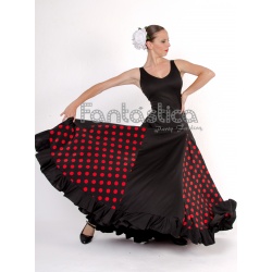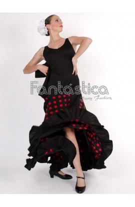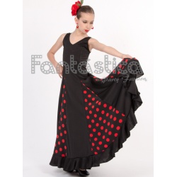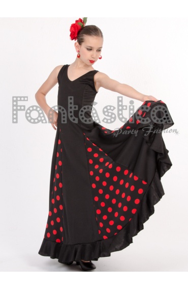 Beautiful Flamenco and Sevillanas Black Dress with Red Polka Dots for Girl and Woman. Amazing Flamenco and Sevillanas Dress perfect to dance any sort of Spanish Dance. Get the Flamenca, Gitana, Faralae, Andalusian and Folklórica look with this Black Dress with Red Polka Dots and Flounce. Sizes for Girl and Woman.