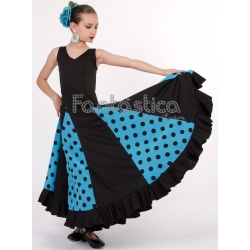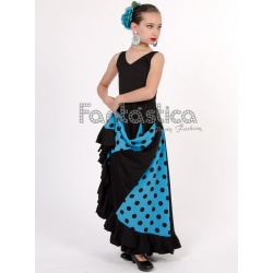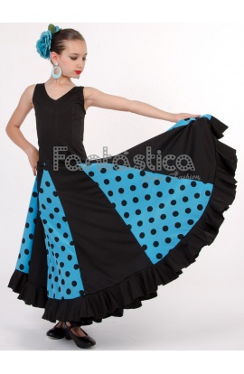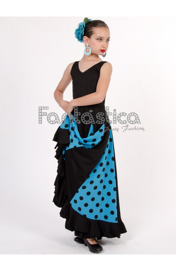Beautiful Flamenco and Sevillanas Black and Blue Dress with Black Polka Dots for Girl and Woman. Amazing Flamenco and Sevillanas Dress perfect to dance any sort of Spanish Dance. Get the Flamenca, Gitana, Faralae, Andalusian and Folklórica look with this Black and Blue Dress with Black Polka Dots and Flounce. Sizes for Girl and Woman.