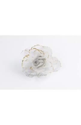 Bellísima flor blanca para el pelo, con detalle de escarcha brillante dorada sobre el borde de los pétalos, fabulosa para resaltar sobre tu cabello con cualquier peinado: en la parte superior de la cabeza, como bailaora flamenca, para recoger un mechón de pelo en el lateral, sujetar una coleta o para usarla detrás de la oreja con el pelo suelto, a la altura del cuello. Un complemento sexy, elegante, romántico y muy femenino, perfecto para te veas FANTÁSTICA! Color: Blanco. Ideal para peinados de novias y madrinas, bodas, comuniones, fiestas, eventos, espectáculos de danza, disfraces de Andaluza, Sevillana, Flamenca, Faralae, Gitana, etc. Puedes usar una flor de forma individual o armar una corona de flores, tiara o tocado floral utilizando varias piezas según el peinado (suelto o recogido). Un modelo de flor para el cabello simplemente PRECIOSA. ¡IDEAL PARA NOVIAS!
