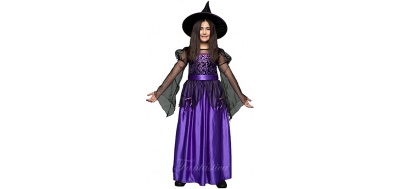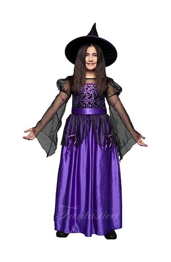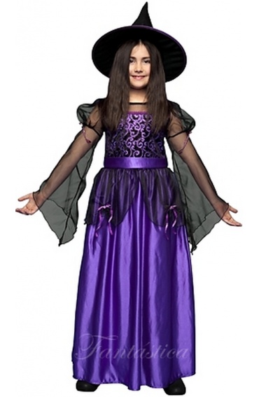 Disfraz para Niña Bruja. Bonito disfraz de brujita que incluye un magnífico vestido morado largo, con decoración en el pecho de arabescos morados sobre fondo negro, cinturilla morada y dos velos negros que caen a la cadera con cintas malva; las mangas en velo negro transparente, son largas estilo campana con cintas moradas, todo a juego con un precioso sombrero negro con cinta morada. Ideal como disfraz de Halloween!