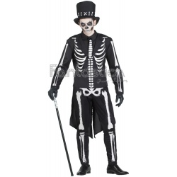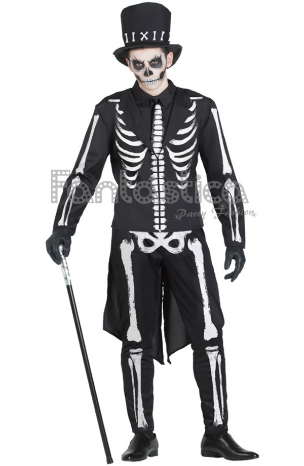 Disfraz para Hombre de Esqueleto con Chaqué. Horripilantemente elegante disfraz de esqueleto, que incluye sombrero, chaqueta con cuello y corbata y pantalones. El disfraz de Esqueleto con Chaqué hará que todos tiemblen de miedo en Halloween o en cualquier evento, feria, fiesta temática de disfraces, despedidas de soltero/a, Carnaval, etc. en que luzcas este magnífico disfraz.