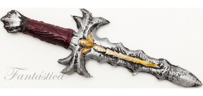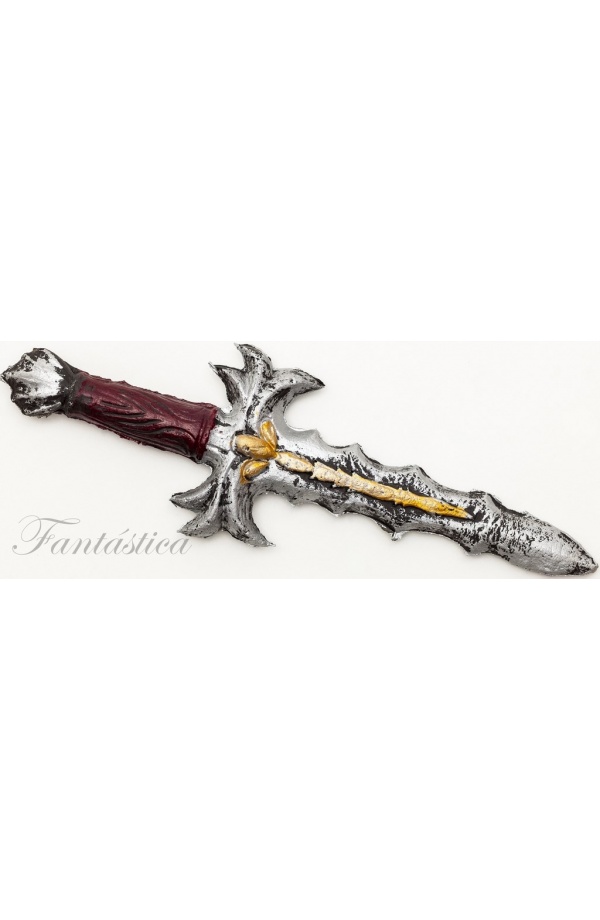 Cuchillo de Guerra para Disfraz. Sensacional puñal con el mango en color rojo borgoña y con la hoja de puntas salientes a los lados del filo y un fenomenal decorado dorado en el centro, que hará que luzcas con tu disfraz mucho más temerario ¡Una daga de lujo! Ideal para completar tu disfraz de Carnaval, Halloween, despedidas de soltero/a, fiestas, espectáculos y eventos especiales.