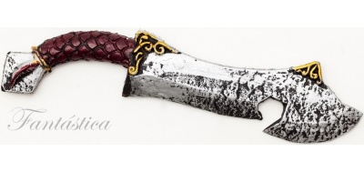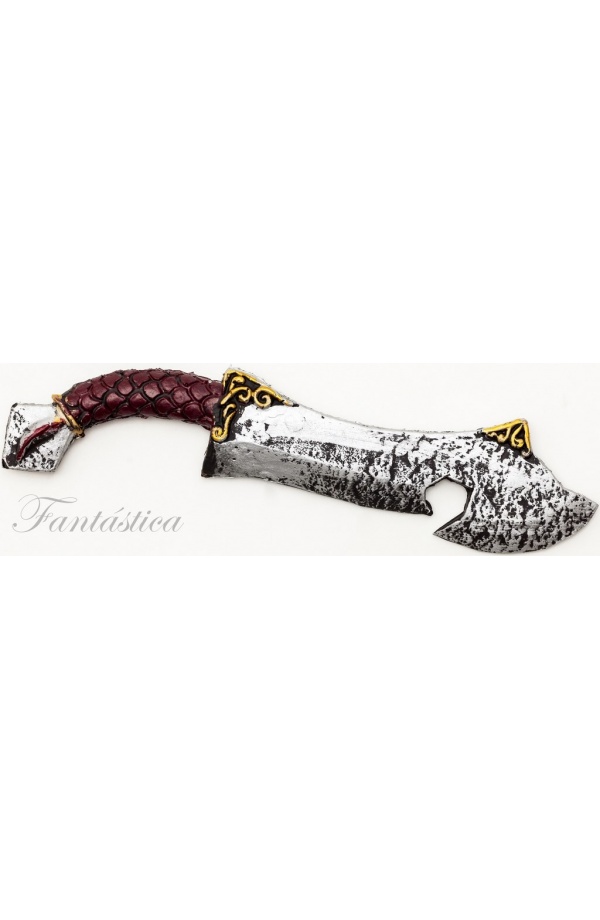 Cuchillo de Guerra para Disfraz. Impresionante puñal con el mango arqueado simil piel de serpiente en color rojo borgoña y cabo en forma de diamante plateado con rojo; hoja de punta tipo hacha, con abertura y luego chuchillo para mejor desgarre de las víctimas ¡Salvaje! Ideal para completar tu disfraz de Carnaval, Halloween, despedidas de soltero/a, fiestas, espectáculos y eventos especiales.