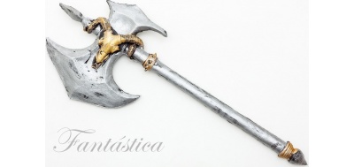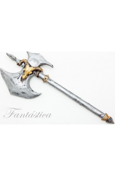 Hacha Medieval para Disfraz. Fenomenal hacha medieval para disfraz en color plateado, decorada con una cabeza de carnero dorada en la cuchilla, el mango terminado en puntas con dos apliques dorados, para que te veas mucho más temerario con tu disfraz. Ideal para completar tu disfraz de Carnaval, Halloween, despedidas de soltero/a, fiestas, espectáculos y eventos especiales.