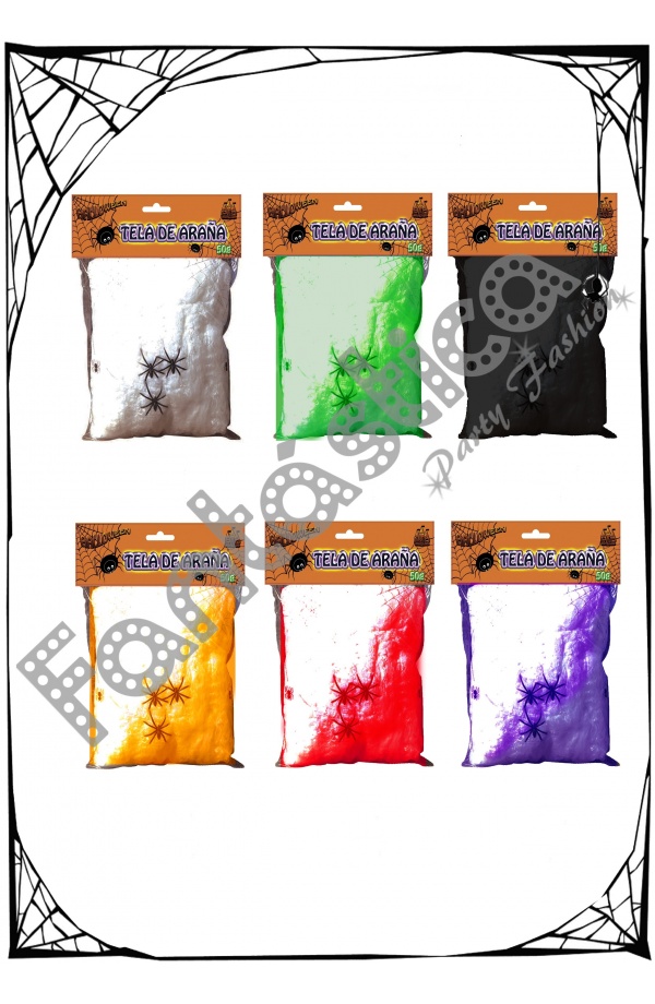 Tela de Araña 50 gr. para Disfraces y Decoración Halloween - Tela de Araña Color Blanco, Verde, Negro, Naranja, Rojo y Violeta