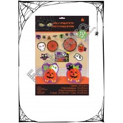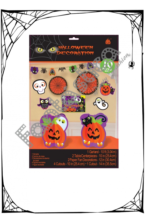 Set para Decoración Halloween de 10 piezas: 1 guirnalda, 2 centros de mesa, 2 decoraciones de abanico, 5 figuras recortables. Estupendo set para decoración de fiestas de Halloween en Discotecas, Pub's, Restaurantes, Colegios y casas particulares y así crear un ambiente autenticamente terrorífico. Set reutilizable. ¡Celebra tu fiesta con la decoración para Halloween de Fantástica!