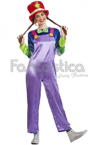 Simpático y colorido Disfraz para Mujer de Payasa, perfecto para Carnaval, Halloween, fiestas de disfraces, despedidas de soltero/a, espectáculos y eventos especiales. El disfraz para mujer de payasita incluye mono con pajarita y sombrero.