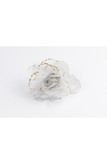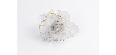 Bellísima flor blanca para el pelo, con detalle de escarcha brillante dorada sobre el borde de los pétalos, fabulosa para resaltar sobre tu cabello con cualquier peinado: en la parte superior de la cabeza, como bailaora flamenca, para recoger un mechón de pelo en el lateral, sujetar una coleta o para usarla detrás de la oreja con el pelo suelto, a la altura del cuello. Un complemento sexy, elegante, romántico y muy femenino, perfecto para te veas FANTÁSTICA! Color: Blanco. Ideal para peinados de novias y madrinas, bodas, comuniones, fiestas, eventos, espectáculos de danza, disfraces de Andaluza, Sevillana, Flamenca, Faralae, Gitana, etc. Puedes usar una flor de forma individual o armar una corona de flores, tiara o tocado floral utilizando varias piezas según el peinado (suelto o recogido). Un modelo de flor para el cabello simplemente PRECIOSA. ¡IDEAL PARA NOVIAS! Modelo Irene.