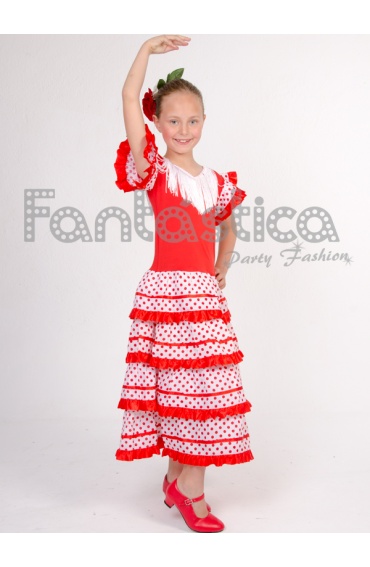 Vestido de Flamenca / Sevillana para Niña Color Rojo con Lunares II